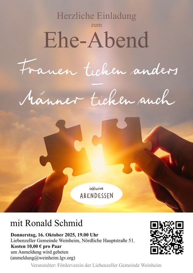 Im Ehe-Abend am 16.10. wollen wir uns mit den kleinen und großen Unterschieden zwischen Männern und Frauen befassen und wie sie eine Paar-Beziehung herausfordernd machen, aber auch bereichern können.